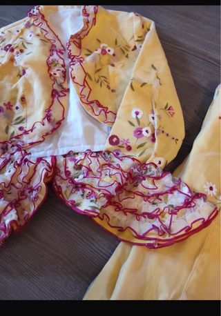Traje de flamenca con un bonito estampado floral en tonos amarillos y detalles en rojo. - Diseño con volantes en la falda. - Mangas con volantes. - Incluye collar de perlas.