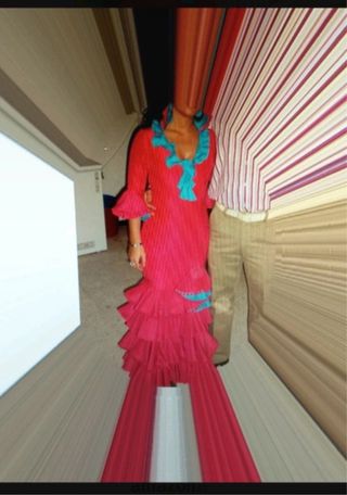 Vestido de flamenca con un diseño vibrante y detalles llamativos. - Mangas acampanadas con volantes. - Adornos de volantes en cascada en la falda. - Cuello con volantes y detalle de lazo.