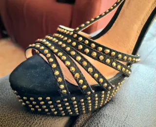Elegantes zapatos de tacón alto, perfectos para eventos especiales. - Diseño de tiras con tachuelas doradas. - Tacón de aguja. - Cierre de pulsera al tobillo.