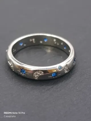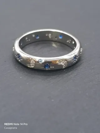 Anillo tipo alianza con diseño Noche. Circonitas azules y blancas que forman lunas y estrellas a modo decorativo a lo largo de todo el aro. *Puedes agrupar compras y ahorrar en gastos de envío, contacta. *Respondemos a los mensajes todos los días de la semana *Precios especiales en compras de diferentes artículos. *No hacemos entregas en mano.
