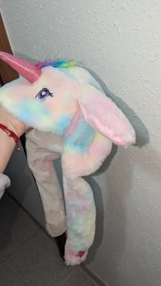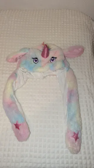 Divertido gorro de unicornio con orejas que se mueven al apretar las patitas. - Diseño de unicornio con cuerno brillante. - Orejas largas y suaves. - Estrellas decorativas en las puntas de las orejas.