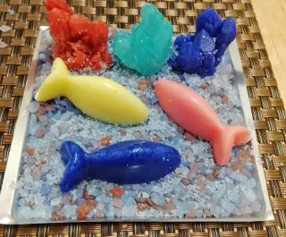 Conjunto de jabones artesanales con un diseño único. - Jabones con forma de pez. - Cristales decorativos en tonos azules y rojizos.
