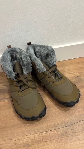 Botas de estilo barefoot con forro interior de pelo sintético. - Color verde oliva y gris. - Cierre con cordones. - Suela flexible.
