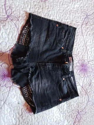 Shorts vaqueros de color negro con un diseño moderno y detalles de tachuelas plateadas en los bajos. - Diseño desgastado con rotos. - Tachuelas plateadas decorativas. - Cintura con trabillas para cinturón. -muy cortos -NO ENVÍO