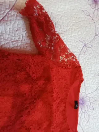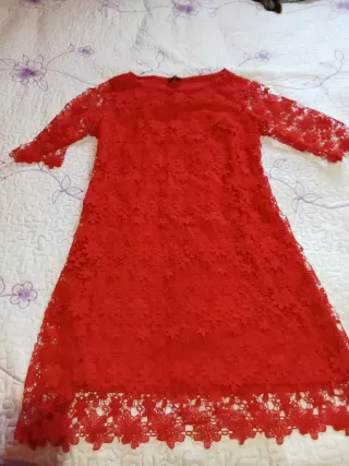 Elegante vestido rojo con detalles de encaje, ideal para eventos especiales. Su diseño con manga al codo y corte recto lo hace muy favorecedor. - Tejido principal de encaje floral. - Manga tonta con detalle de encaje en los puños. - Bajo del vestido con acabado de encaje. - Largo hasta la rodilla. -NO ENVÍO