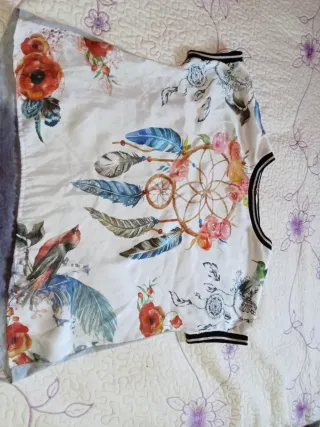 Camiseta de manga corta con un bonito estampado de estilo boho. - Diseño con atrapasueños, plumas y flores. - Detalle de pájaros. - Ribetes en cuello y mangas. -por delante es viscosa suave y detrás algodón (camiseta) -NO ENVÍO