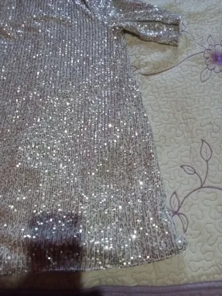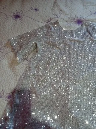 Vestido de fiesta con un diseño brillante y elegante, perfecto para ocasiones especiales. - Cubierto de lentejuelas plateadas. - Manga corta. - Corte recto. -largo por la rodilla o un poco menos -NO ENVÍO