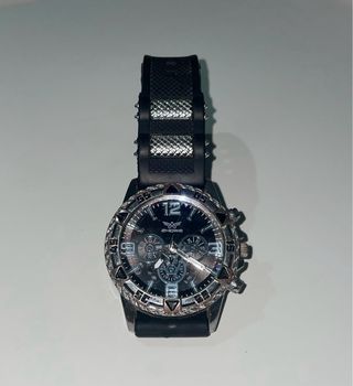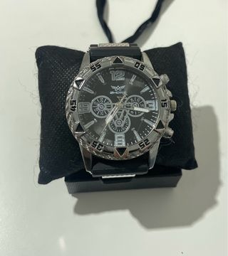 Reloj de pulsera con un diseño moderno y llamativo. - Esfera negra con detalles plateados. - Correa de material sintético. - Bisel con marcadores de hora.