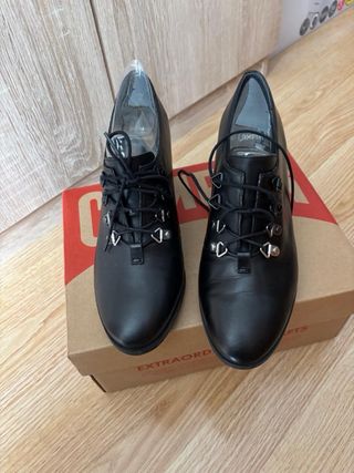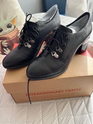 Elegantes zapatos de tacón negros con un diseño de cordones. - Tacón grueso y cómodo. - Detalle de ojales metálicos. - Punta fina. - De piel