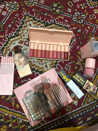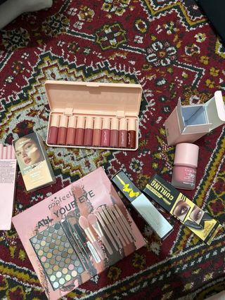 Conjunto de maquillaje que incluye una caja de labiales y una paleta de sombras. - Caja de 10 labiales líquidos. - Paleta de sombras de ojos con múltiples tonos. - Incluye brochas de maquillaje. - Un set de cuidado de la piel.