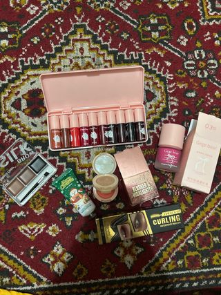 Lote de maquillaje variado, ideal para experimentar con diferentes looks. - Estuche con 10 labiales líquidos en tonos variados. - Paleta de sombras de ojos con 3 tonos. - Colorete y iluminador en crema. - Máscara de pestañas negra. - Crema de manos temática navideña.