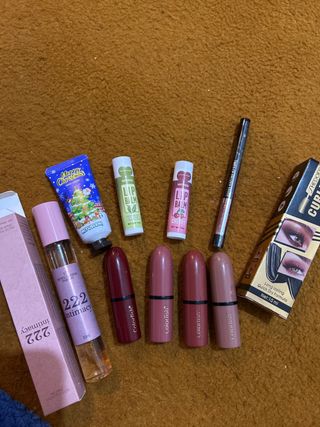 Lote variado de productos de maquillaje y cuidado personal. - Tres labiales Colorfish en tonos rosados y rojizos. - Un perfume 222 Intimacy de 33ml. - Un delineador de ojos. - Dos bálsamos labiales. - Una crema de manos temática de Navidad.