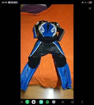 Mono de cuero para chica en talla XS. Diseño con detalles en azul y dorado. - Material: Cuero. - Cierre de cremallera. - Puños elásticos.
