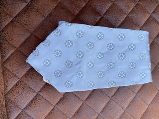 Elegante corbata con un discreto diseño. - Color base gris claro. - Patrón repetido de pequeñas estrellas plateadas. - Tejido con un ligero brillo.