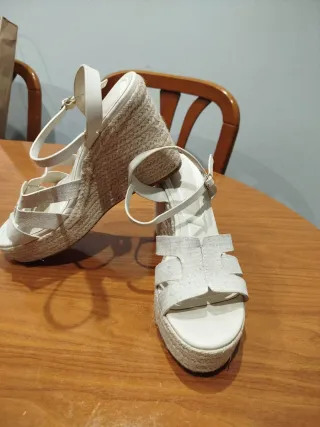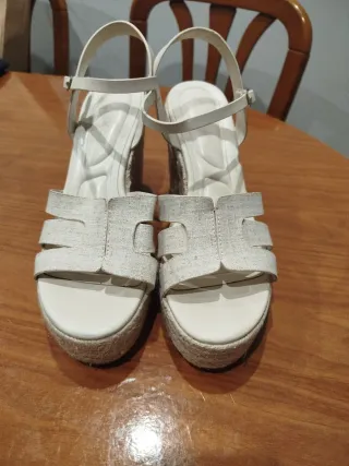 Sandalias tipo cuña en color beige y blanco. Tienen una tira delantera trenzada y una tira al tobillo con hebilla. - Diseño de cuña con plataforma. - Tira frontal tejida. - Cierre de hebilla ajustable.