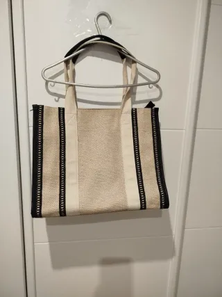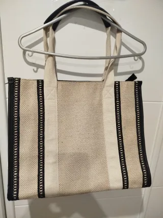 Bolso de tela con un diseño moderno y práctico. - Material de lona resistente. - Detalles en contraste. - Asas cómodas para llevar al hombro. Está manchado por dentro como se ve en las fotos, necesita lavado