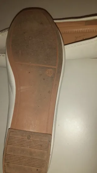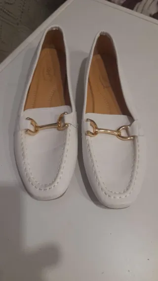 Elegantes zapatos planos en color blanco, perfectos para cualquier ocasión. Cuentan con un detalle metálico dorado en la parte delantera que les da un toque sofisticado. - Diseño tipo mocasín. - Detalle de hebilla dorada. - Costuras decorativas.