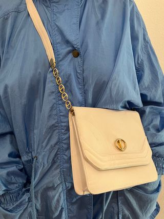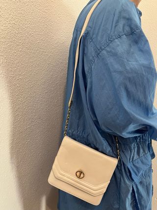 Bolso de hombro Christian Dior vintage 80s. 17x18x5 cm Inscripción “Christian Dior Made in France” en el interior se conservo perfectamente. Bolsillos interior tiene un desgarre al lado de principio de cremallera que no afecta su funcionamento. Correa con eslabones dorados parcialmente descoloridos. - Cierre de solapa con detalle placa logo dorado (algo floja)y clip antiguo que funciona bien. - Acabado texturizado con algunas arrugas y manchas. - Dentro blanco amarillo con algunas manchas. - Olor a guardado.