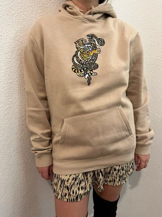Sudadera con un diseño llamativo de tigre y serpiente (bordado). Las medidas aproximadas: Hombros 49 Sisa a sisa 58 Ancho en la goma 50 Largo 67 - Estampado frontal detallado. - Bolsillo tipo canguro. - Capucha con cordón ajustable.