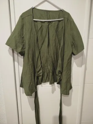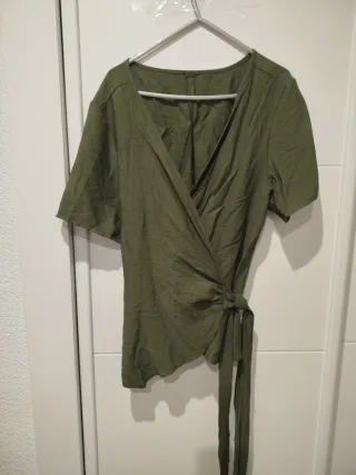 Camisa de manga corta con diseño cruzado y lazada lateral. - Tejido ligero y con textura. - Escote en V. - Lazada ajustable en la cintura.
