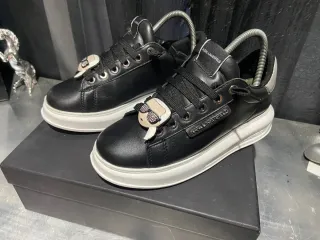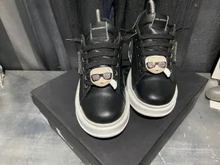 Zapatillas de la marca Karl Lagerfeld en talla 37. Combinan un diseño moderno con detalles únicos. - Exterior de cuero negro. - Suela blanca de plataforma. - Adorno frontal con figura. - Logo de la marca en el lateral y la lengüeta.