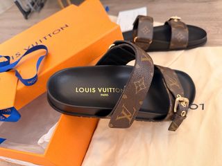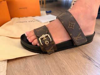 Sandalias planas Louis Vuitton. - Diseño cruzado con monograma. - Hebilla dorada ajustable. - Suela cómoda.