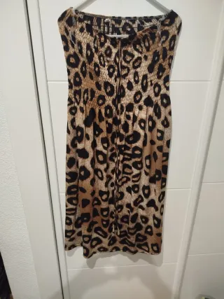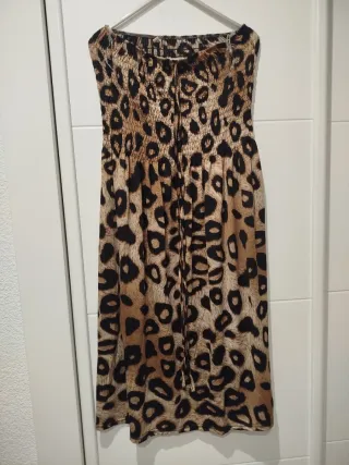 Vestido largo sin tirantes con un llamativo estampado de leopardo. La parte superior es elástica y fruncida, con un cordón ajustable en el centro para un mejor ajuste. - Estampado de leopardo. - Diseño sin tirantes. - Cintura elástica fruncida. - Cordón frontal ajustable.