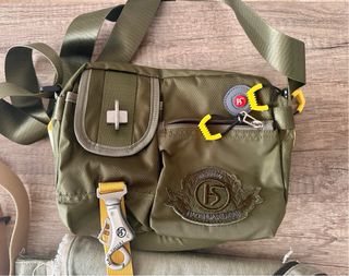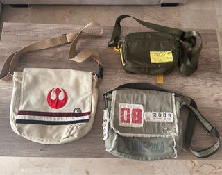 Conjunto de tres bolsos bandolera con diseños variados. - Bolso beige con logo de Star Wars. - Bolso verde militar con etiqueta. - Bolso estilo militar con parches y detalles desgastados. Escucha ofertas, por el lote de los 3, o de forma individual,