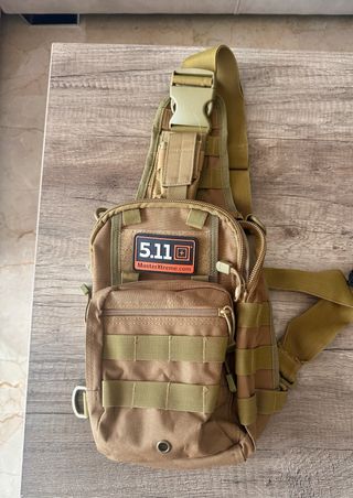 Bolso bandolera táctico de color beige. - Compartimento principal con cremallera. - Bolsillo frontal con cierre de clip. - Correa ajustable para el hombro. - Panel de velcro para parches. - funda extra en molle superior