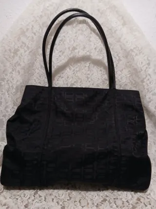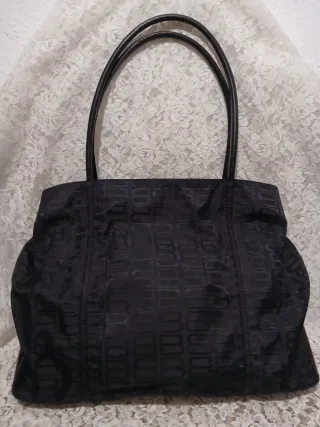 Bolso Tote de mano o hombro con un discreto logo repetido en toda la tela. Dispone de dos compartimientos y cierre con solapa y clip magnético. En el interior placa metallica Balenciaga para El Corte Inglés y bolsillo con cremallera. Las medidas aproximadas: 30×37×7 cm - Material principal es lona - Asas de cuero negro. - Diseño con pliegues laterales. - Base de cuero. Ligeras marcas del tiempo en partes de cuero.