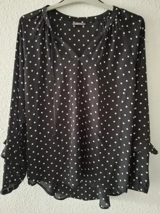 Blusa elegante con estampado de lunares. - Diseño con cuello en V. - Mangas largas con volantes. - Bajo asimétrico.