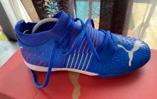 Botas de fútbol Puma para césped artificial (turf). Talla 42. Puestas 1 vez apenas - Diseño en color azul con detalles blancos y naranjas. - Logo de Puma en el lateral.