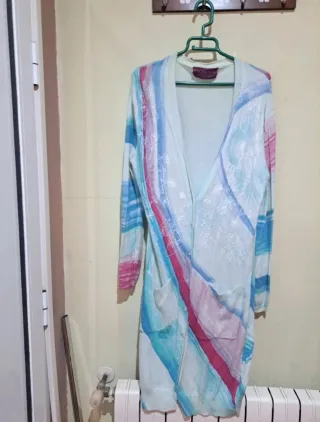 Chaqueta larga de punto de la marca Custo. Talla unica en un bonito estampado de degradados en color pastel. Confeccionada en nylon, viscosa y angora. Se conseva bien aunque presenta pequeñas bolitas en la parte de atrás ( ver ultima foto)