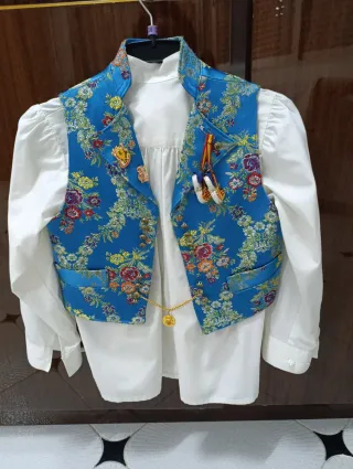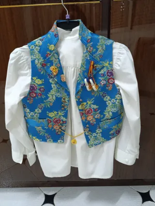 Conjunto de chaleco fallero y camisa blanca. - Chaleco con estampado floral azul. - Camisa de manga larga. - Adorno dorado en el chaleco.