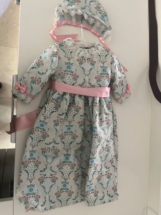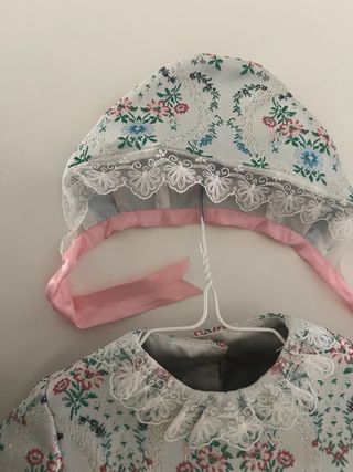 Precioso traje de fallera para niña, con un diseño floral y detalles en rosa. - Tejido con estampado floral y detalles brillantes. - Cinturón de tela rosa. - Lazos a juego en las mangas. - Incluye capota a juego.