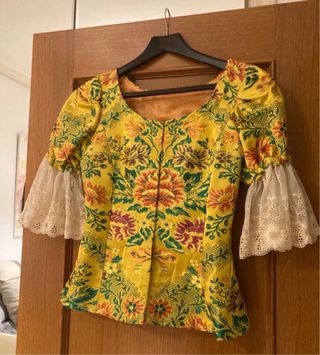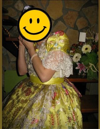 Traje de fallera con un diseño vibrante y detallado. - Tejido principal amarillo con estampado floral. - Mangas con encaje blanco. - Adornos dorados y morados en el cuello y hombros.