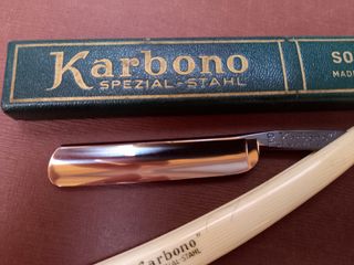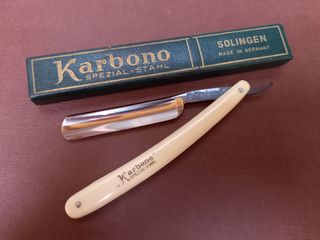 Navaja de afeitar clásica de la marca Karbono, fabricada en Solingen, Alemania lista para afeitar barbero barbería rasoio Filarmonica - Hoja de acero especial. - Mango de color beige. - Acabado plateado de la hoja.