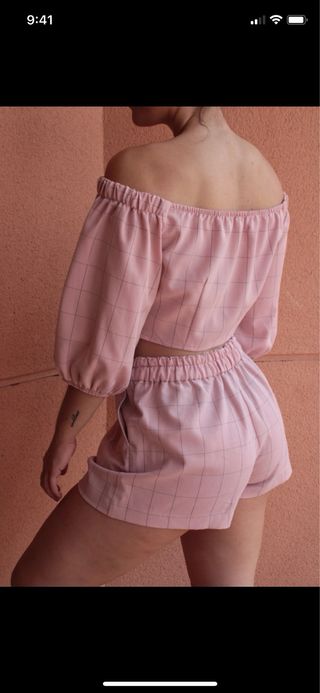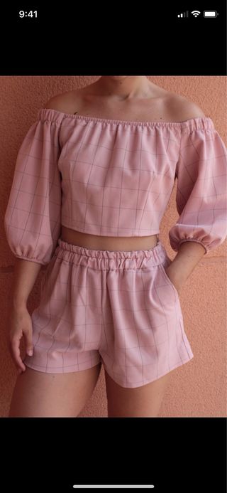 Conjunto de dos piezas con estampado de cuadros. - Top estilo bandeau con mangas abullonadas. - Pantalón corto con cintura elástica.