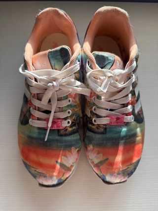 Zapatillas deportivas Adidas Torsion con un diseño vibrante y colorido. - Estampado floral y de paisajes. - Cierre con cordones blancos. - Detalle de las tres rayas de Adidas en los laterales.