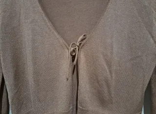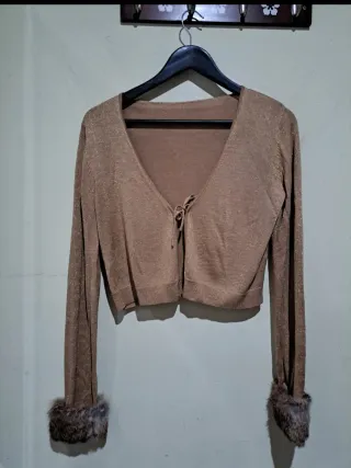 Estilosa chaqueta/ bolero de Induyco (,!El Corte Ingles) talla L en glitter dorado con elegantes puños en pelo ( que pueden quitarse porque van abotonados) confeccionada en parte en seda de ahi su brillo y suavidad