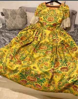 Traje de fallera con un vibrante diseño floral. - Tejido de seda con estampado. - Mangas cortas abullonadas. - Falda larga y voluminosa.