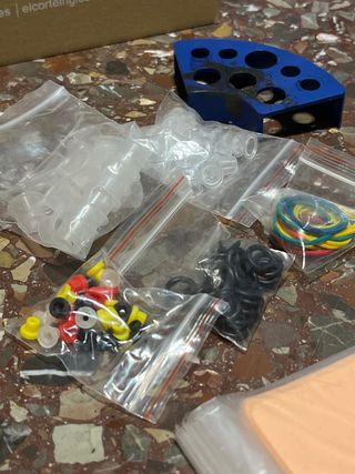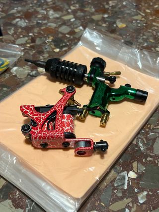 Set de máquinas de tatuar profesionales, una en color rojo y otra en verde, junto con una piel sintética para practicar. - Incluye dos máquinas de tatuar. - Incluye una piel sintética para práctica. - Incluye gomas