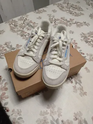 Zapatillas deportivas de estilo clásico. - Diseño en color beige y blanco. - Detalle del logo de Adidas en azul.