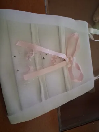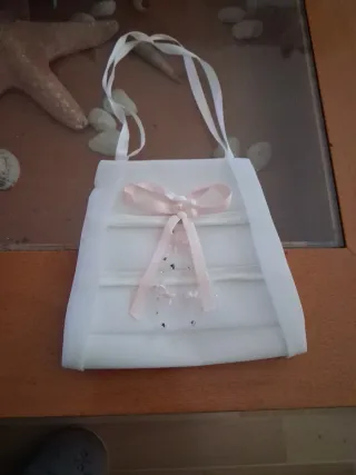 Precioso bolsito blanco con detalles en rosa, ideal para comuniones. Se encuentra como nuevo. - Adornado con lazo y flores. - Cintas blancas para llevar. - Pequeños adornos brillantes.