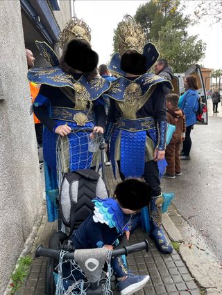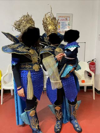Impresionante disfraz inspirado en el mar, con detalles en azul y dorado. - Diseño elaborado con escamas y elementos marinos. - Incluye corona y armadura detallada. - Ideal para fiestas temáticas o disfraces. - Talla única.