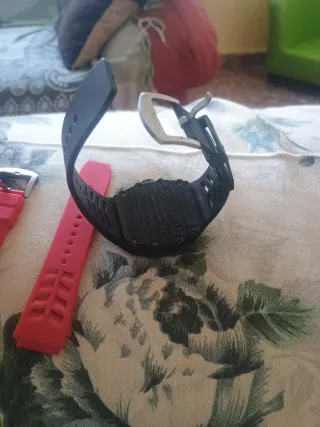 Reloj con correa negra y una correa adicional roja. - Diseño moderno. - Correa de caucho. - Hebilla metálica.