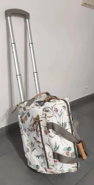Práctico trolley de viaje con un bonito estampado floral. Medidas: Ancho 42 Alto 35 Profundidad 22 - Asa extensible para facilitar el transporte. - Dos asas de mano. - Cremalleras doradas. - Con muchos compartimientos