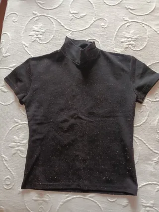 Top elegante con un sutil brillo que añade un toque especial. - Diseño de cuello alto. - Manga corta. - Tejido con detalles brillantes.