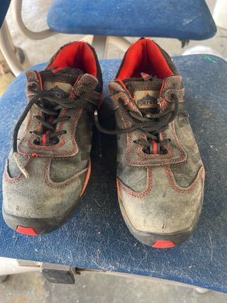 Zapatillas de trabajo Portwest con detalles en rojo. - Exterior de ante y textil. - Forro interior textil. - Suela de goma antideslizante.