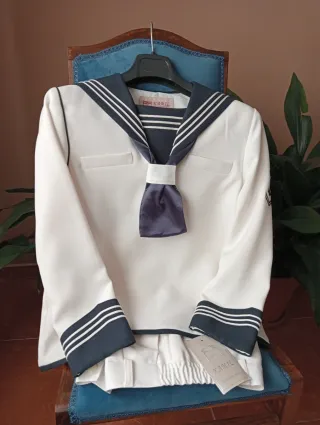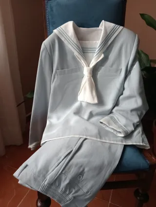 Traje de comunión de estilo marinero. - Chaqueta blanca con cuello de marinero y detalles grises. - Corbata blanca. - Pantalón gris azulado - Insignia bordada en la manga.
